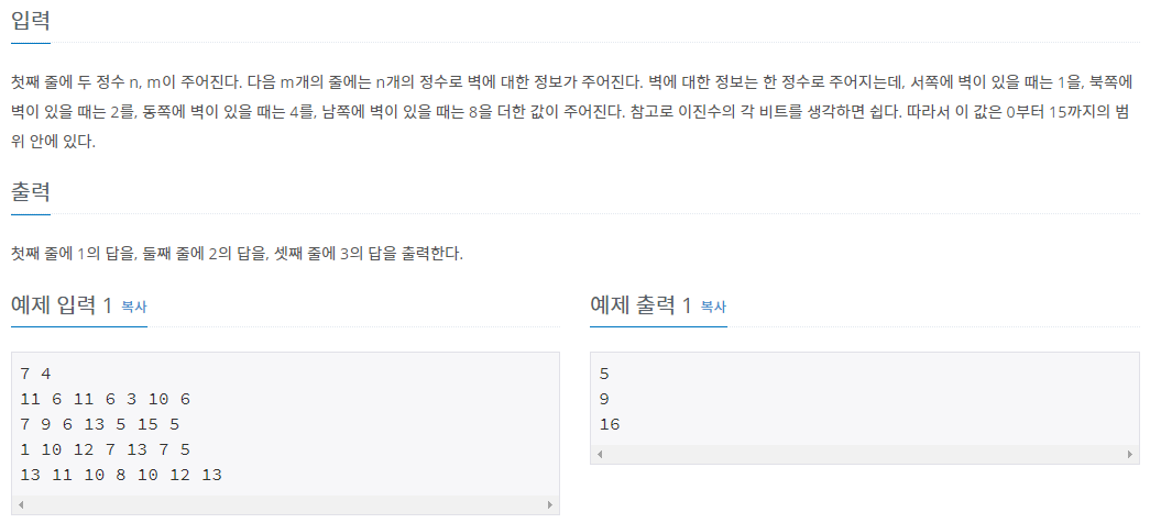 첫째 줄에 두 정수 n, m이 주어진다. 다음 m개의 줄에는 n개의 정수로 벽에 대한 정보가 주어진다. 벽에 대한 정보는 한 정수로 주어지는데, 서쪽에 벽이 있을 때는 1을, 북쪽에 벽이 있을 때는 2를,