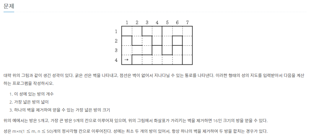 3) 하나의 벽을 제거하여 얻을 수 있는 가장 넓은 방의 크기는 벽을 하나씩 제거해 보면서, 각 방의 크기를 구하고, 그 중 가장 큰 방을 계산하여 구합니다.