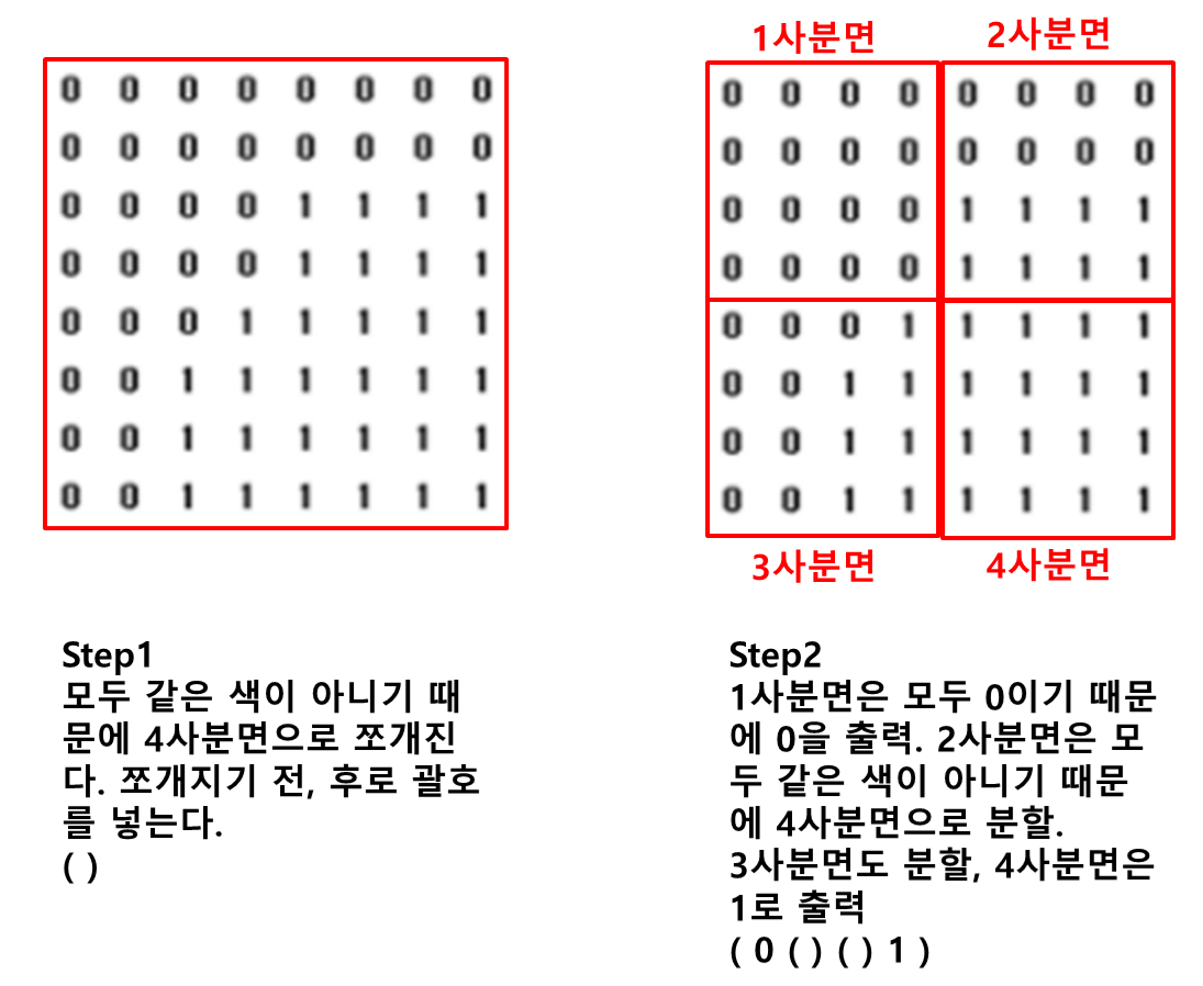 주어진 영상이 모두 0으로만 되어 있으면 압축 결과는 "0"이 되고, 모두 1로만 되어 있으면 압축 결과는 "1"이 된다. 만약 0과 1이 섞여 있으면 전체를 한 번에 나타내지를 못하고, 왼쪽 위, 오른쪽 위, 왼쪽 아래, 오른쪽 아래, 이렇게 4개의 영상으로 나누어 압축하게 되며, 이 4개의 영역을 압축한 결과를 차례대로 괄호 안에 묶어서 표현한다.