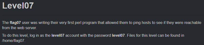 login은 ID/PW를 level07/level07로 하고, 이 레벨을 위한 파일은 /home/flag07에 있다고 합니다.